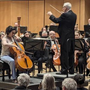 February 2025 Concert Rehearsal, Shostakovich Cellist Christine Lamprea with replacement conductor James Setapen(Photos by Yancey Hughes)
